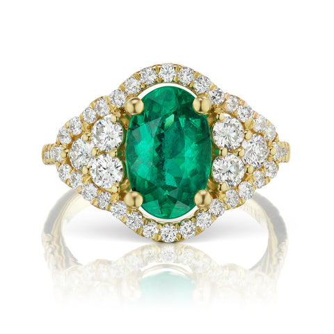 This 18kt yellow gold emerald and diamond ring features 1 oval emerald weighing 2.61ct, 6 round brilliant cut diamonds weighing 0.52ct total weight, and 40 round brilliant cut diamonds weighing 0.58ct total weight. Sizes 5 thru 7 are available for purchase online. Sizes less than 5 and greater than 7 are...