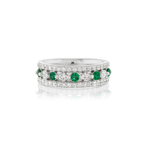 This 14kt white gold wide emerald and diamond band designed by Barmakian Jewelers features 5 round emeralds weighing 0.32ct total weight, 4 round brilliant cut diamonds weighing 0.26ct total weight and 38 round brilliant cut diamonds weighing 0.40ct total weight. Sizes 5 thru 7 are available for purchase online. Sizes less...