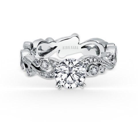 This 18kt white gold timeless classic is a artistic design engagement ring from the Kirk Kara's Pirouetta collection. It features round brilliant cut diamonds weighing 0.10ct total weight of diamonds and signature handcrafted details include signature filigree, peek-a-boo diamonds and milgrain edging. Designed for a .75CT center stone but can...