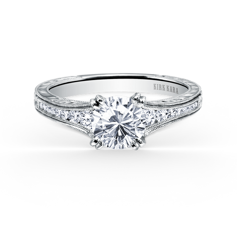 This elegant 18kt white gold Kirk Kara design is a split band diamond engagement ring from the Pirouetta collection. It features 0.33ct total weight of round brilliant cut diamonds. The signature handcrafted details include milgrain edging and filigree. Designed for a 2CT center stone but can be customized to fit...