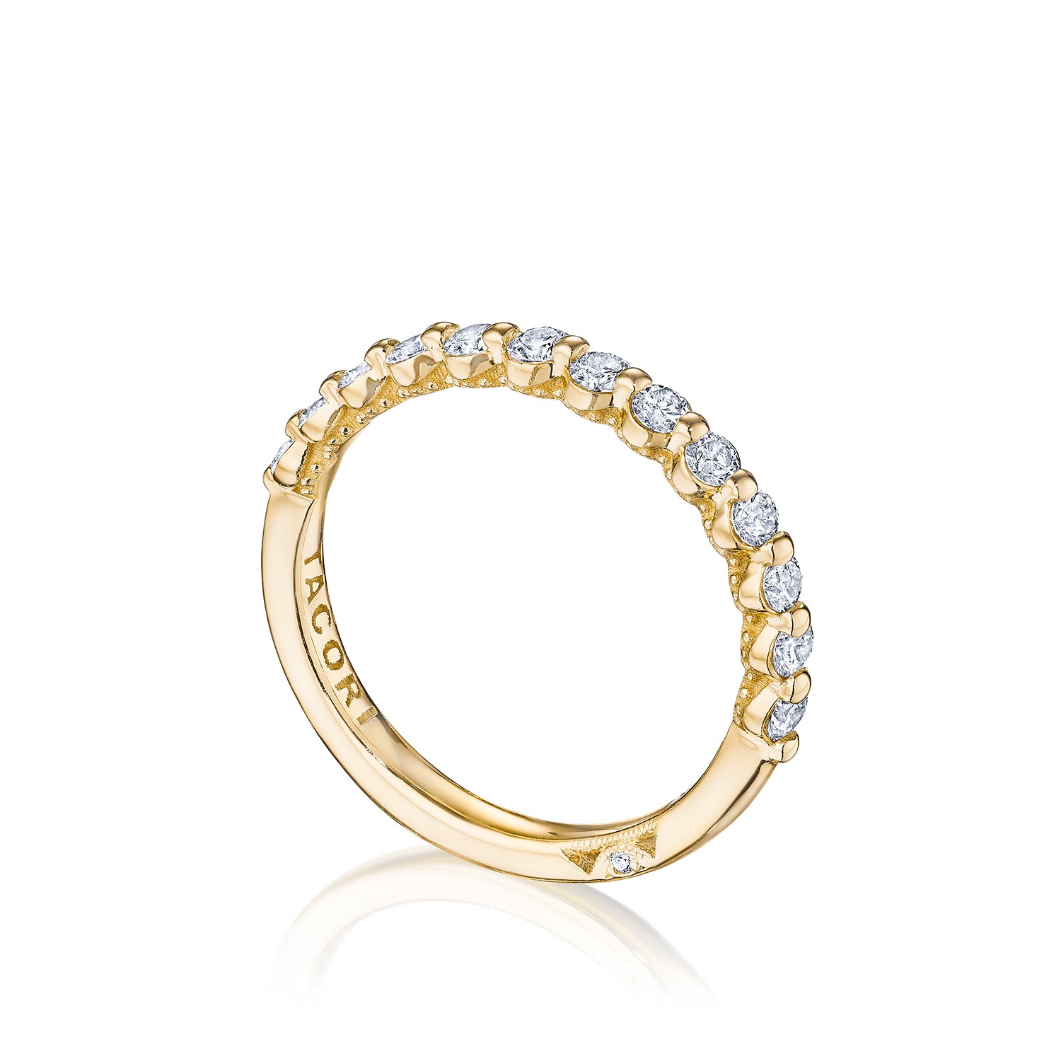Brighten your day with these diamond intense, two prong Sculpted Crescent 1/2 way bands. Pair them with your engagement ring or stack as everyday rings. Featuring round brilliant cut diamonds weighing 0.44ct total weight. Available in 18kt white gold, 18kt yellow gold, 18kt rose gold and platinum. Sizes 5 thru 7 are available for purchase online. Sizes less than 5 and greater than 7 are special orders and can be ordered upon request.